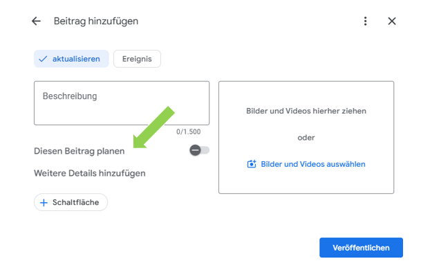 Seit etwa zwei Wochen war das Feature angekündigt — nun ist es endlich in unserer Bearbeitungsoberfläche aufgetaucht und steht auch in den Tourismus-Kategorien zur Verfügung. Ein kleines Update, das große Auswirkungen hat: Die Planungsfunktion für Beiträge im Google Business Profile.